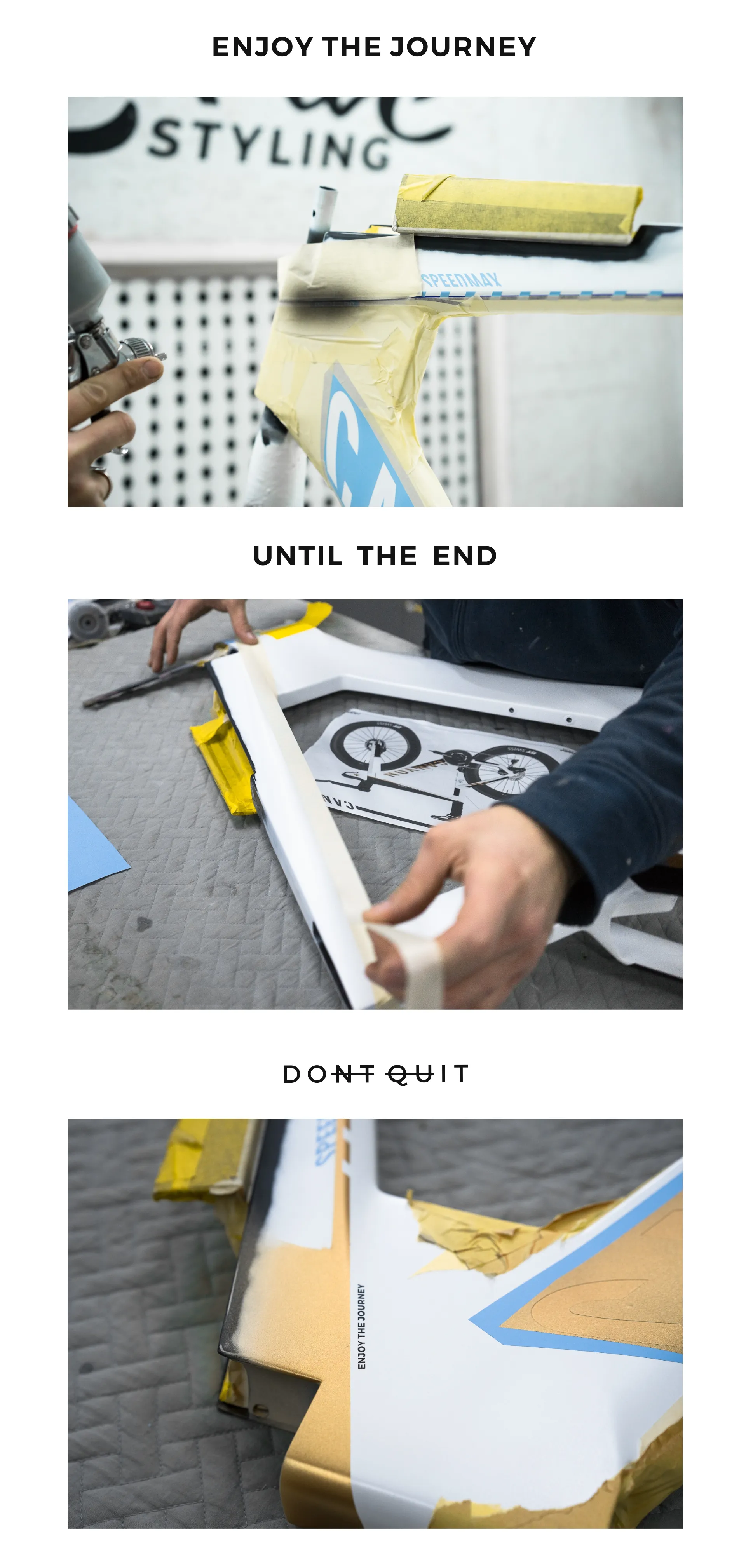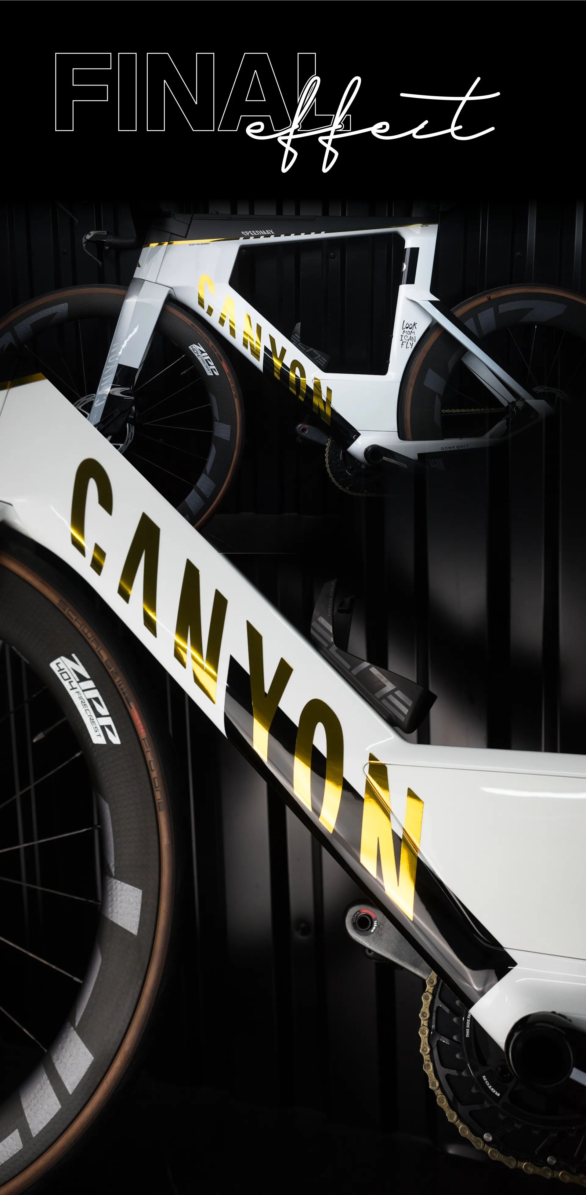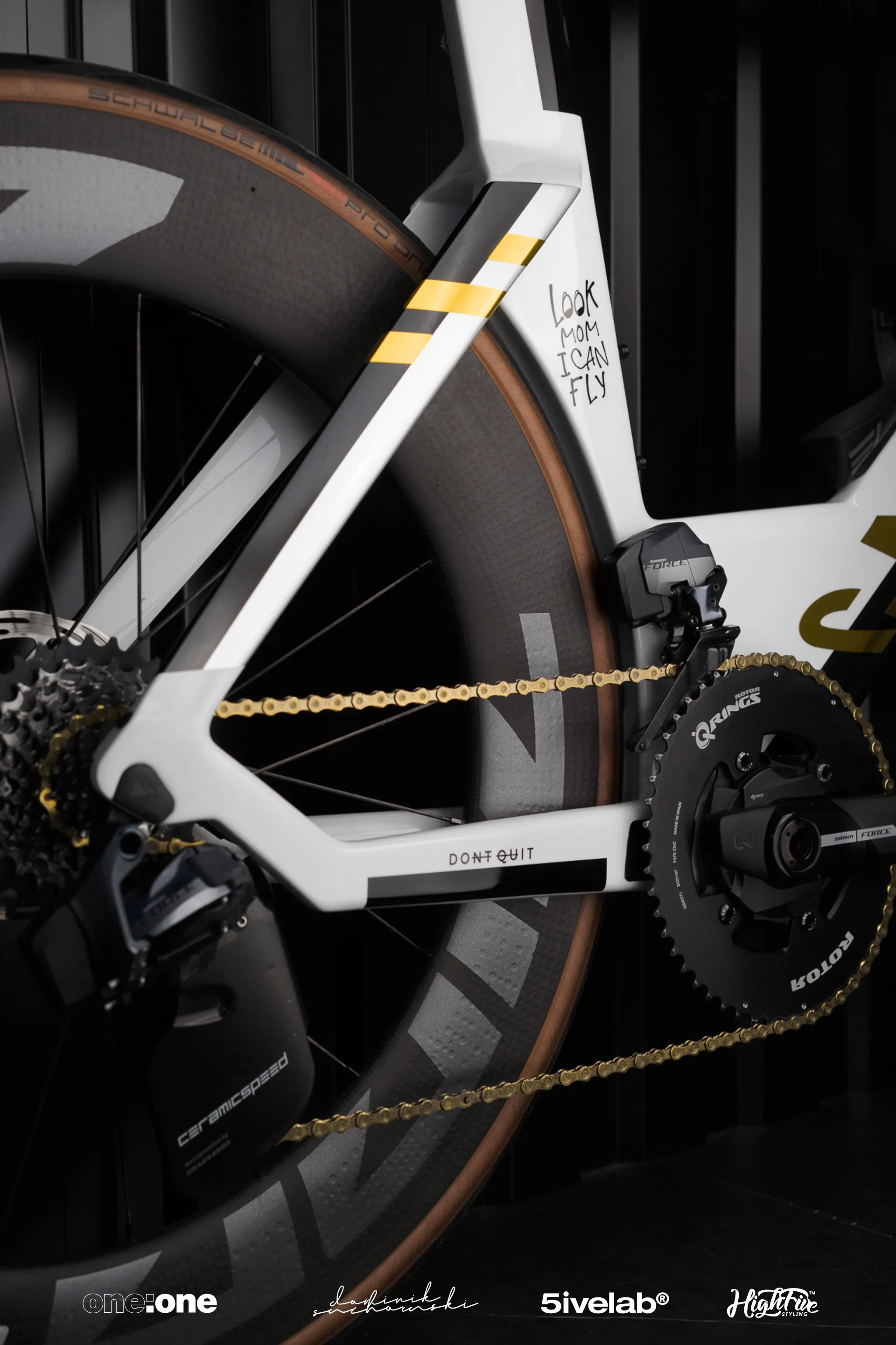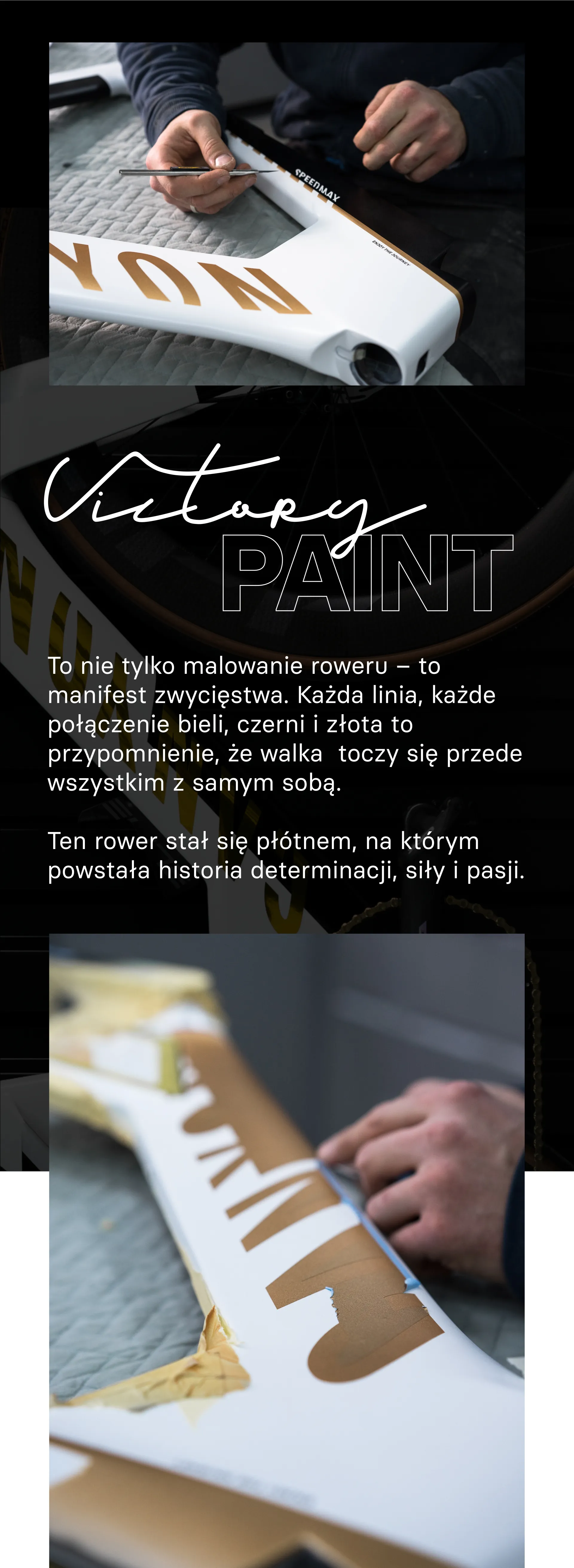 Inspiracją do tego projektu było malowanie roweru Jan'a Frodeno - niemiecki triathlonista, mistrz Olimpijski. Klient przyszedł z pomysłem, żeby odtworzyć ten design niemal 1:1. Odpowiedziałem, ZRÓBMY TO LEPIEJ - nie kopie lecz wersję inspirowaną "Tobą" . Tak powstał plan: podobny układ kolorów, ale z własnymi hasłami, cytatami motywacyjnymi i mocnym akcentem złotego chromu który nawiązuje symboliką do złotego pucharu i przyszłego zwycięstwa.