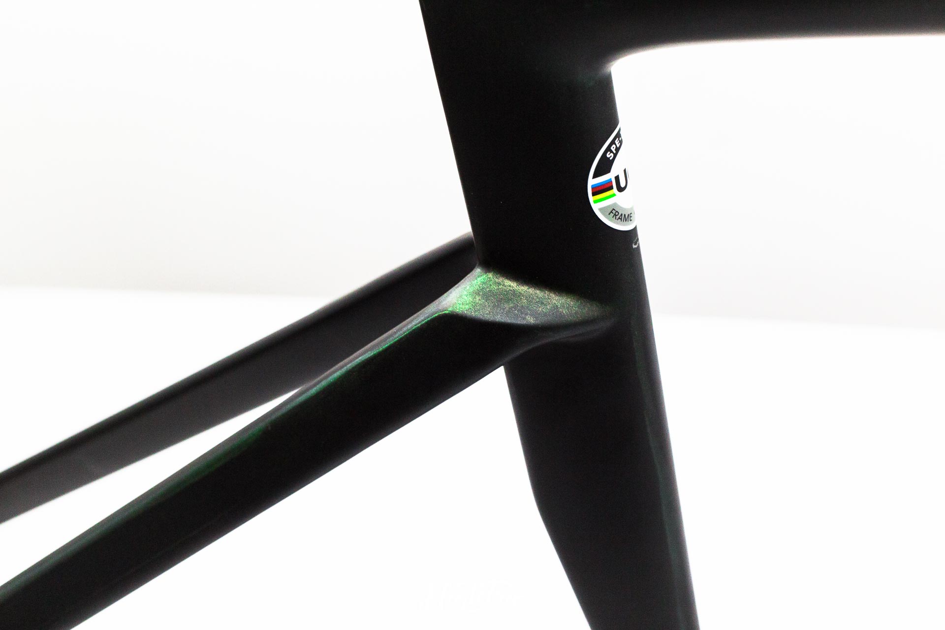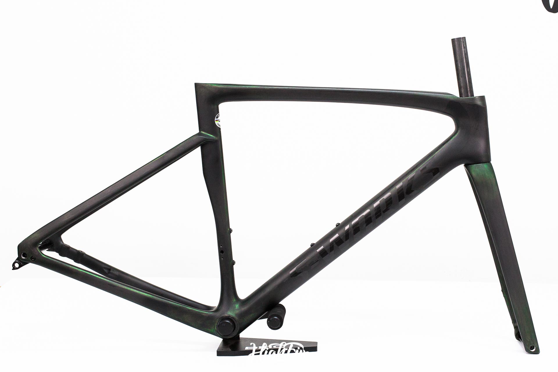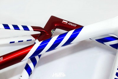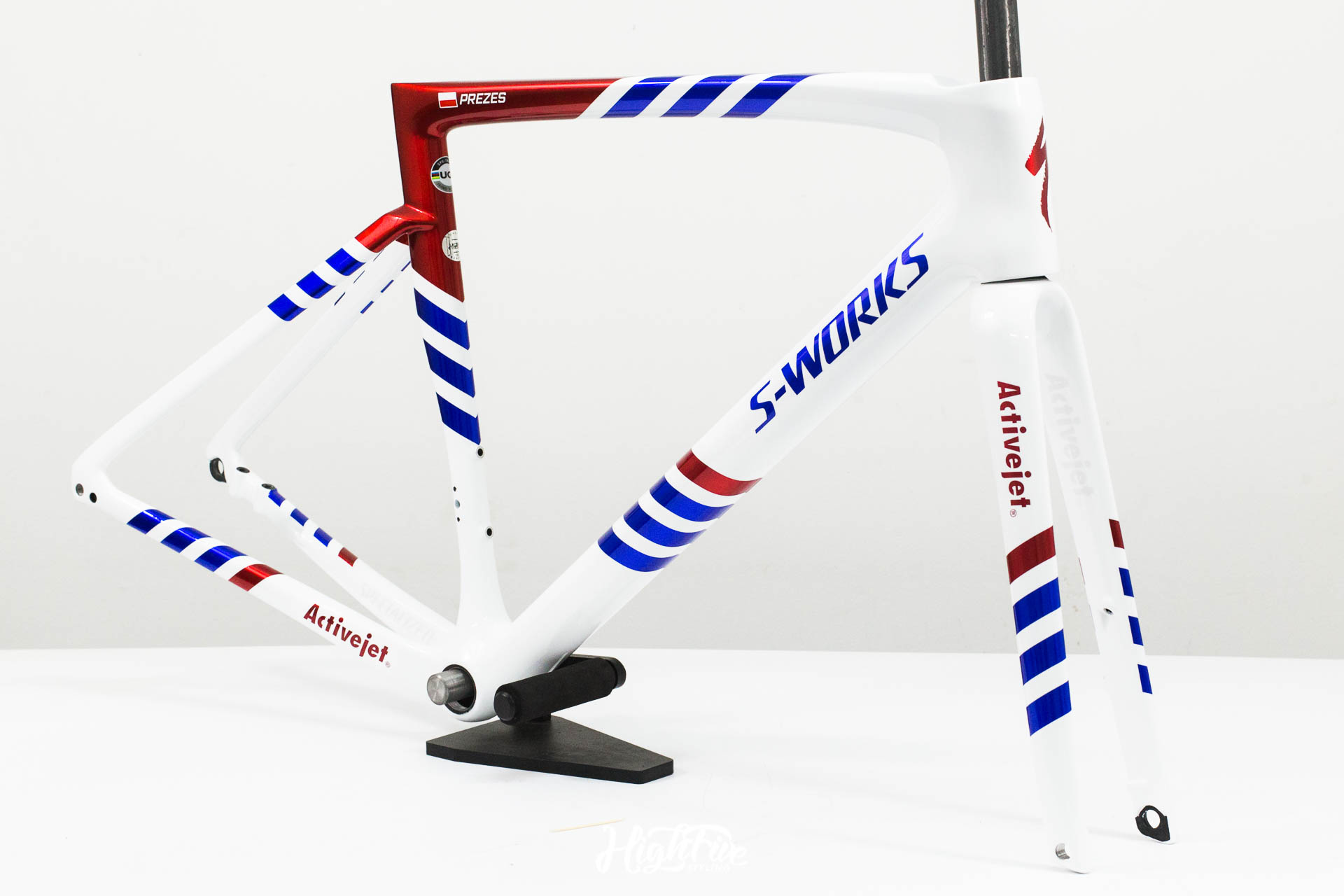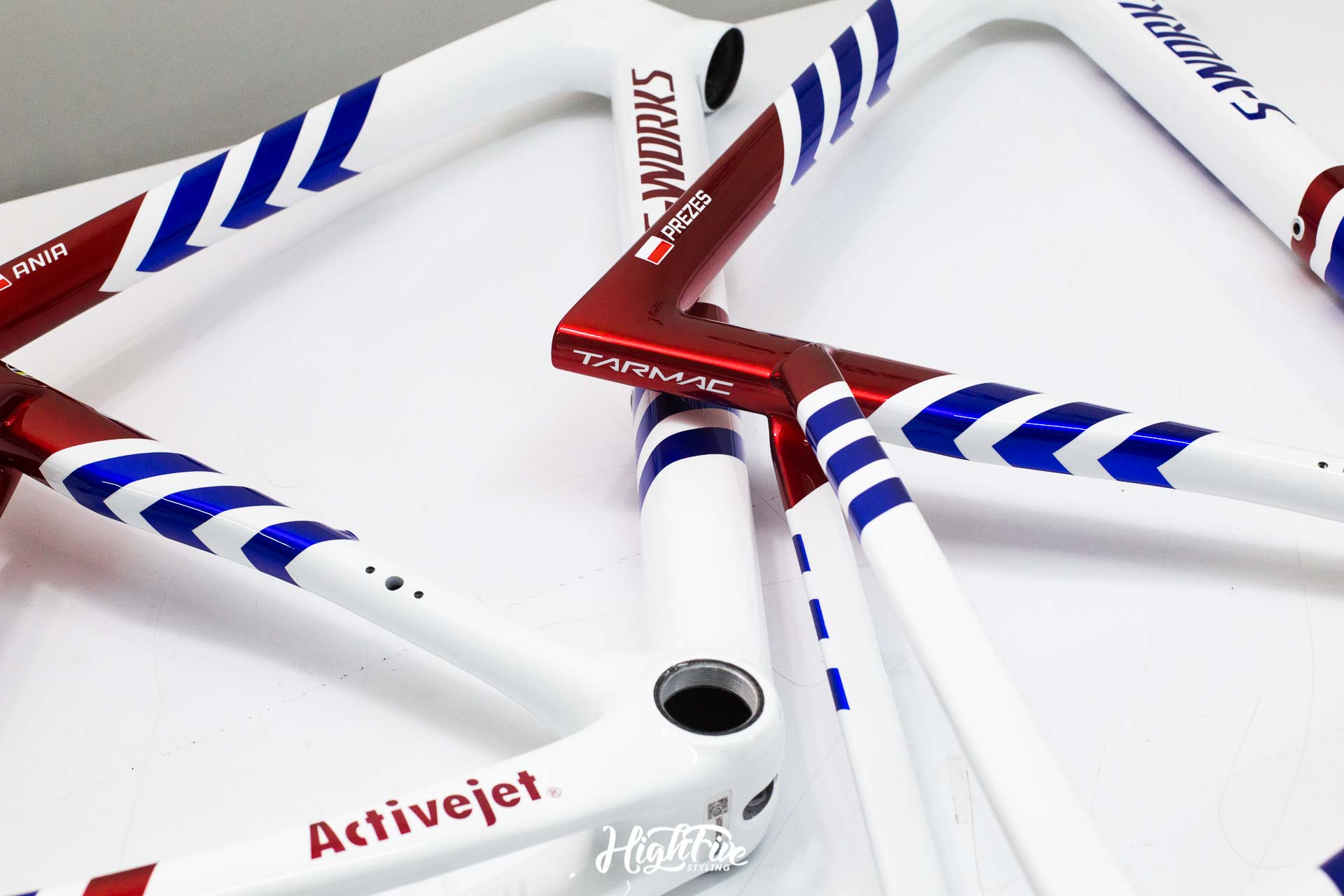 Malowanie ram S-WORKS Tarmac sl7 - to jeden z ciekawszych projektów jakie zrobliśmy. Dwa nowe framsety przyleciały do nas bezpośrednio od producenta. Naszym zdaniem było zaprojektowanie grafiki oraz zdjęcie oryginalnego lakieru do gołego karbonu - celem było zaoszczędzenie 80 gram na ramie. Wykonaliśmy malowanie ram specjalną technologią LIGHT w celu zoptymalizowania wagi lakierów.