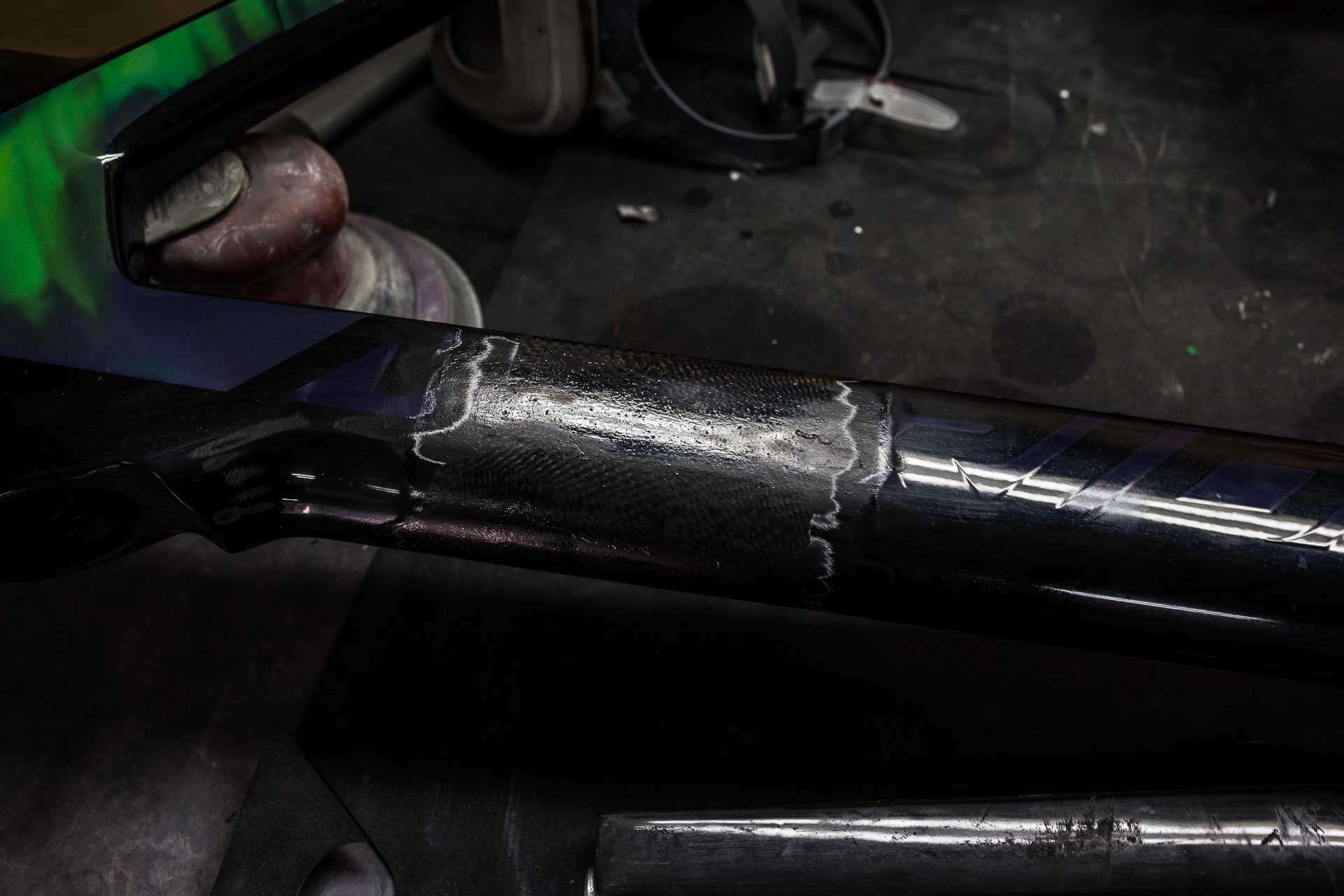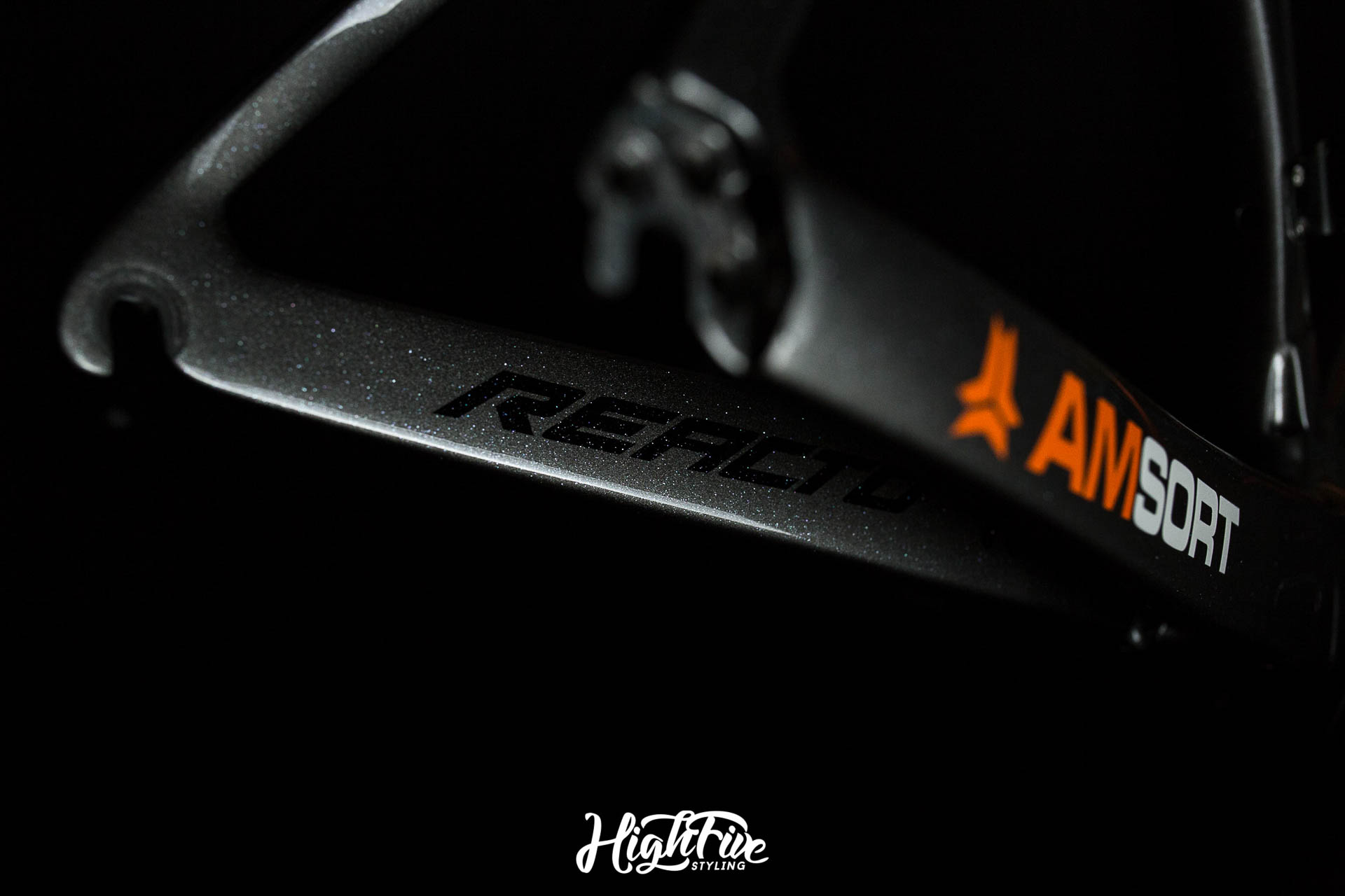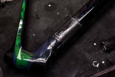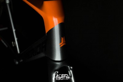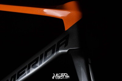 Flagowy rower marki Merida po nieszczęśliwym wypadku przyjechał do nas prosto z firmy CarbonTech - chłopaki zajęli się klejeniem ramy. Naszym zadaniem było wykonanie nowego malowania i szaty graficznej w oparciu o kolory firmy Amsort. Całość zamknięta lakierem bezbarwnym Novol 565-00 z dodatkiem drobinek szkła.
