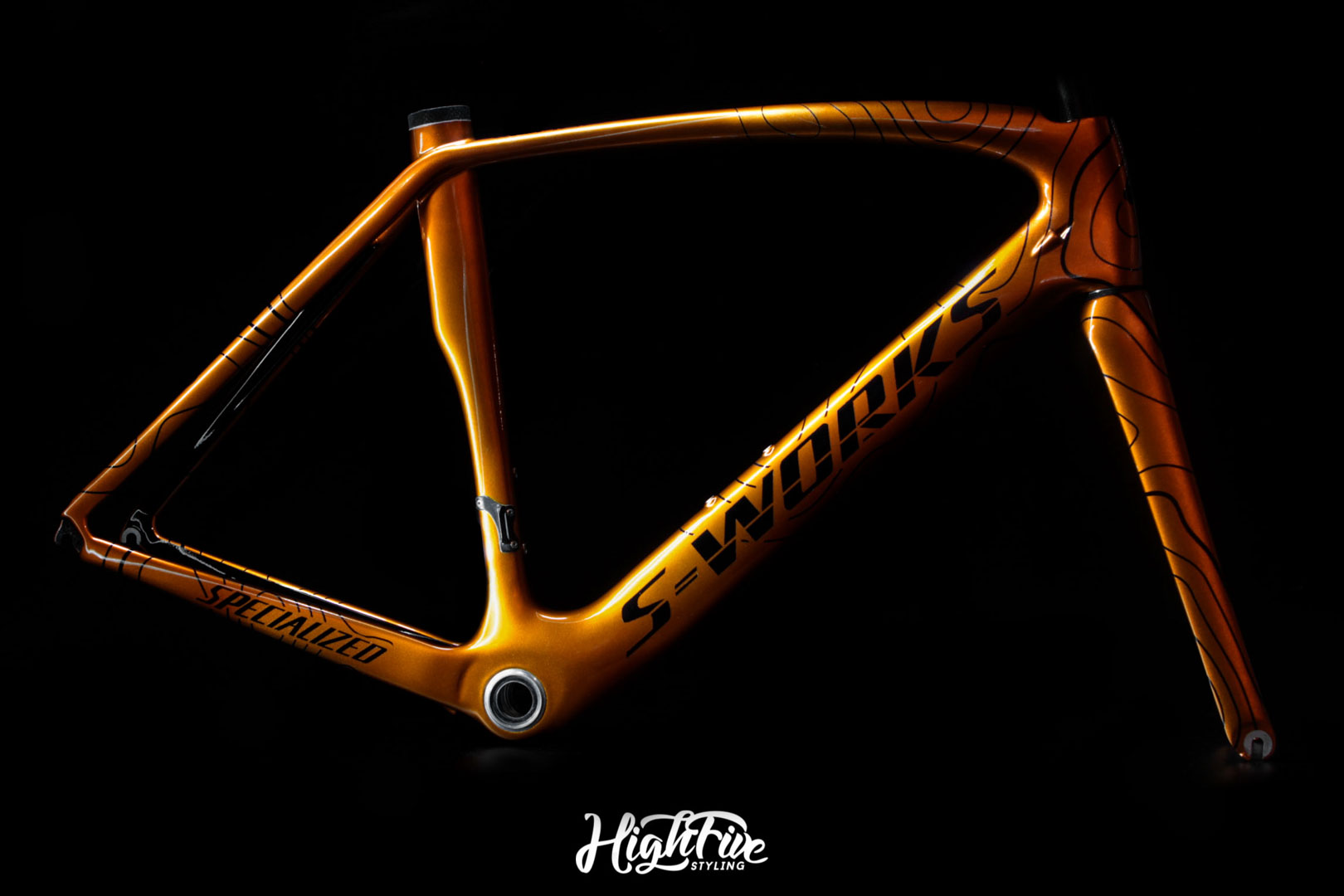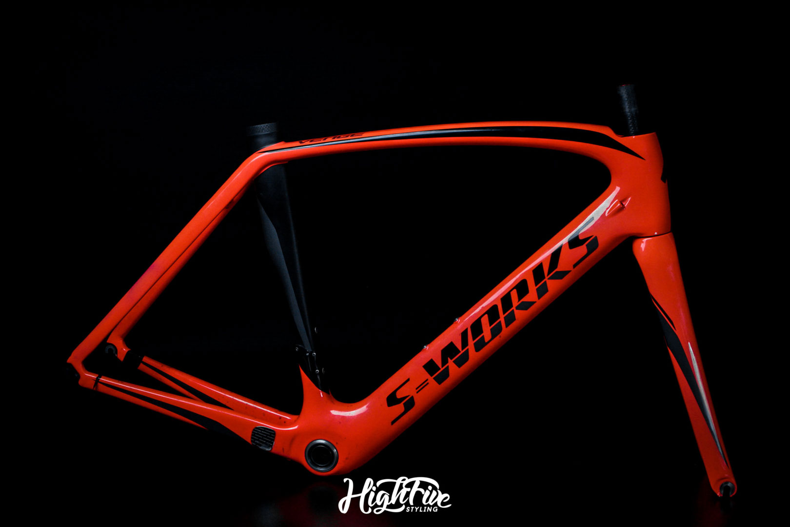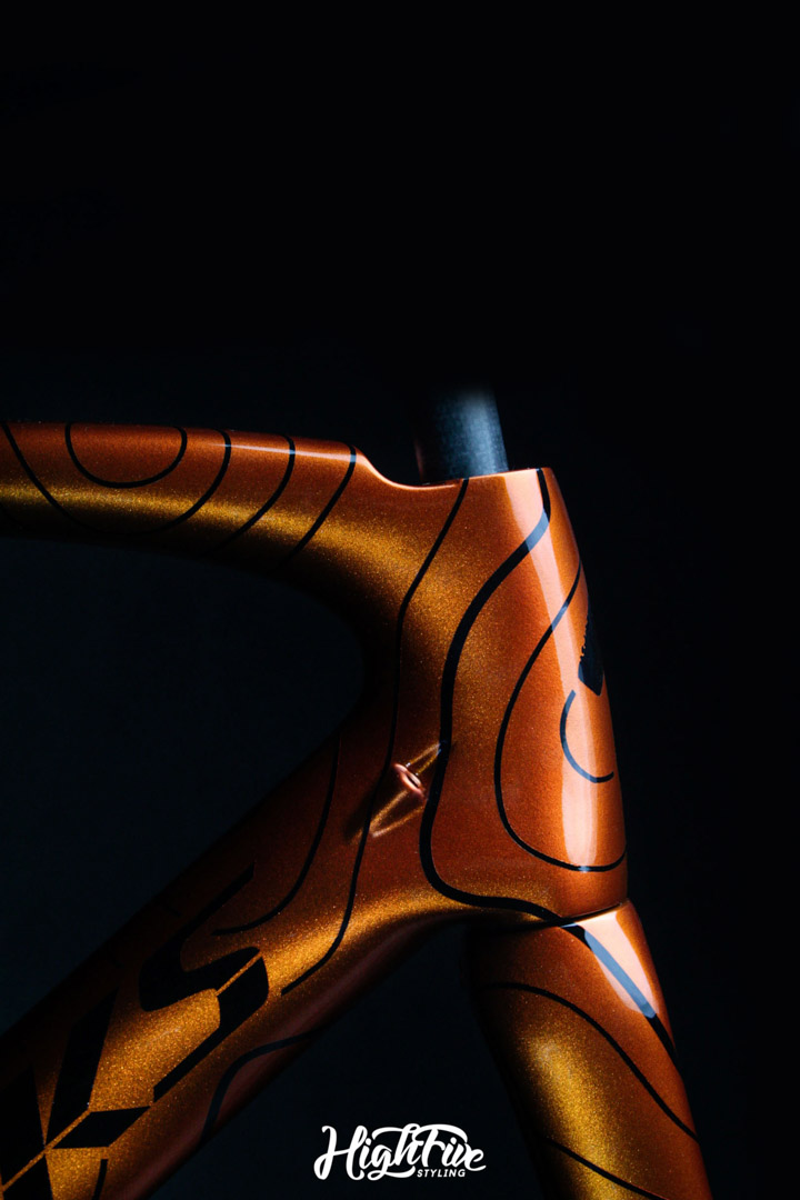 Przy przygotowaniu projektu chcieliśmy zachować profesjonalny wygląd areo, ale nadać mu indywidualny charakter. Finalnie bazowaliśmy na pomarańczowym i rozwinęliśmy jego odcienie, by sprawić, że zawsze wyróżniał się na szosie. Postawiliśmy na trójwarstwowy kolor typu Candy orange. Efekt był oszałamiający! Dla zachowania gwarancji producenta, usunęliśmy lakier z ramy wyłącznie w 40%, po czym położyliśmy podkład wypełniający, aby wyrównać powierzchnie powstałą w procesie szlifowania lakieru.