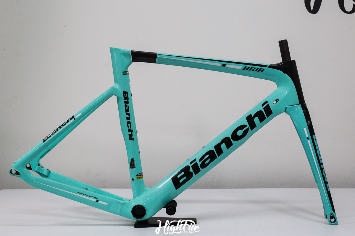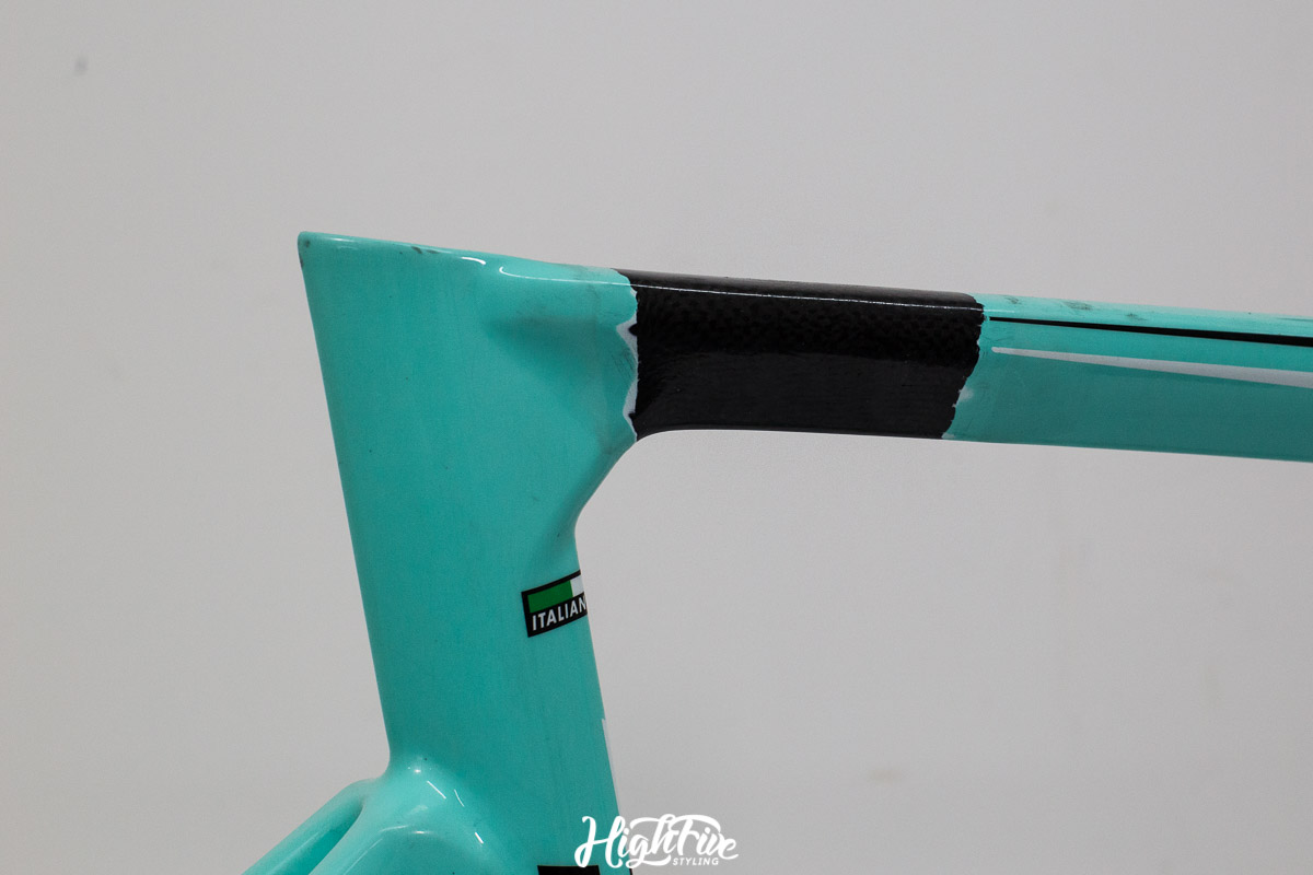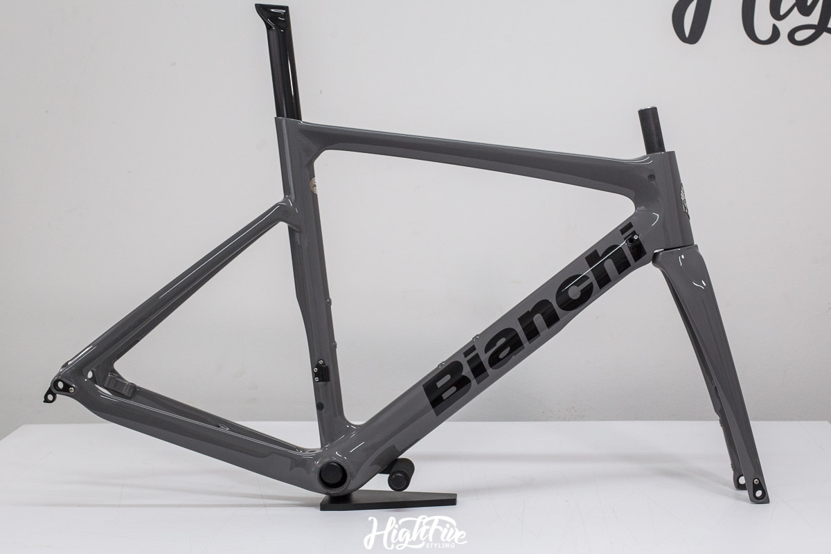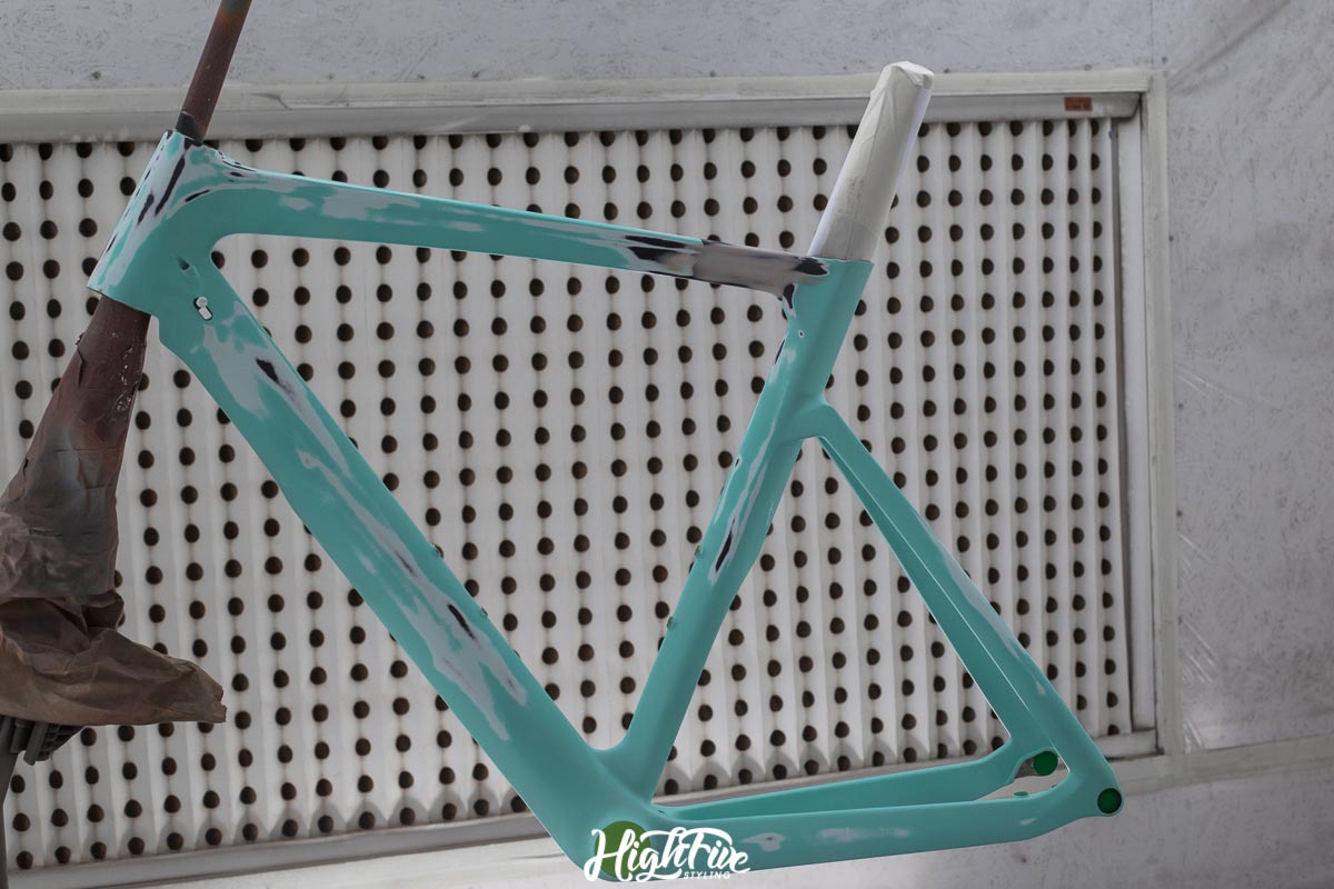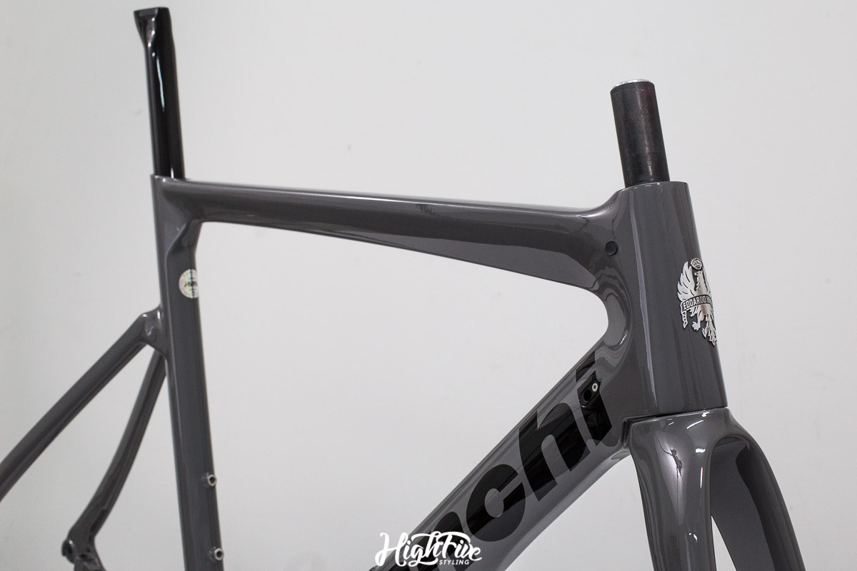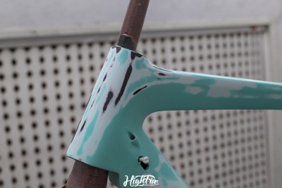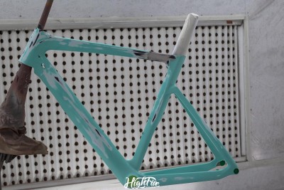 Rama trafiła do nas od chłopaków z Veloart, wcześniej jednak została sklejona w profesjonalnej firmie CarbonTech. Klient chciał zrezygnować z klasycznego koloru CELESTE i pójść w odcienie solidowej szarości.