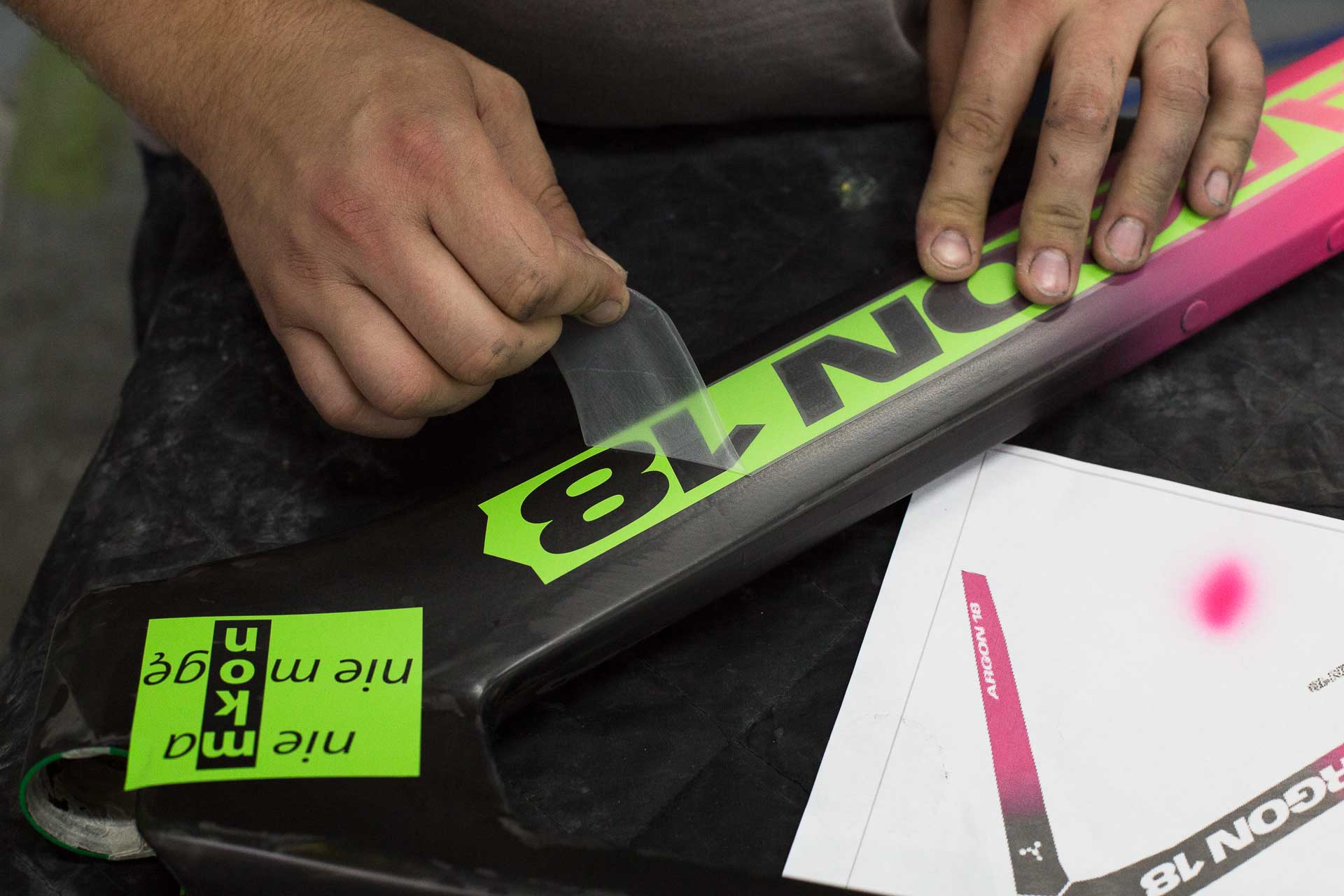 Jedynym wymógiem było stworzenie specjalnego koloru pod barwy MKON - fluo różowy. Postawiliśmy trochę odchudzić oryginalne malowanie usuwając z ramy oryginalny lakier pozostawiając tym samym strukturę karbonu w połysku, dodatkowe cieniowania koloru FLUO PINK i logotypów w białym połysku stworzyły prawdziwe mistrzostwo!